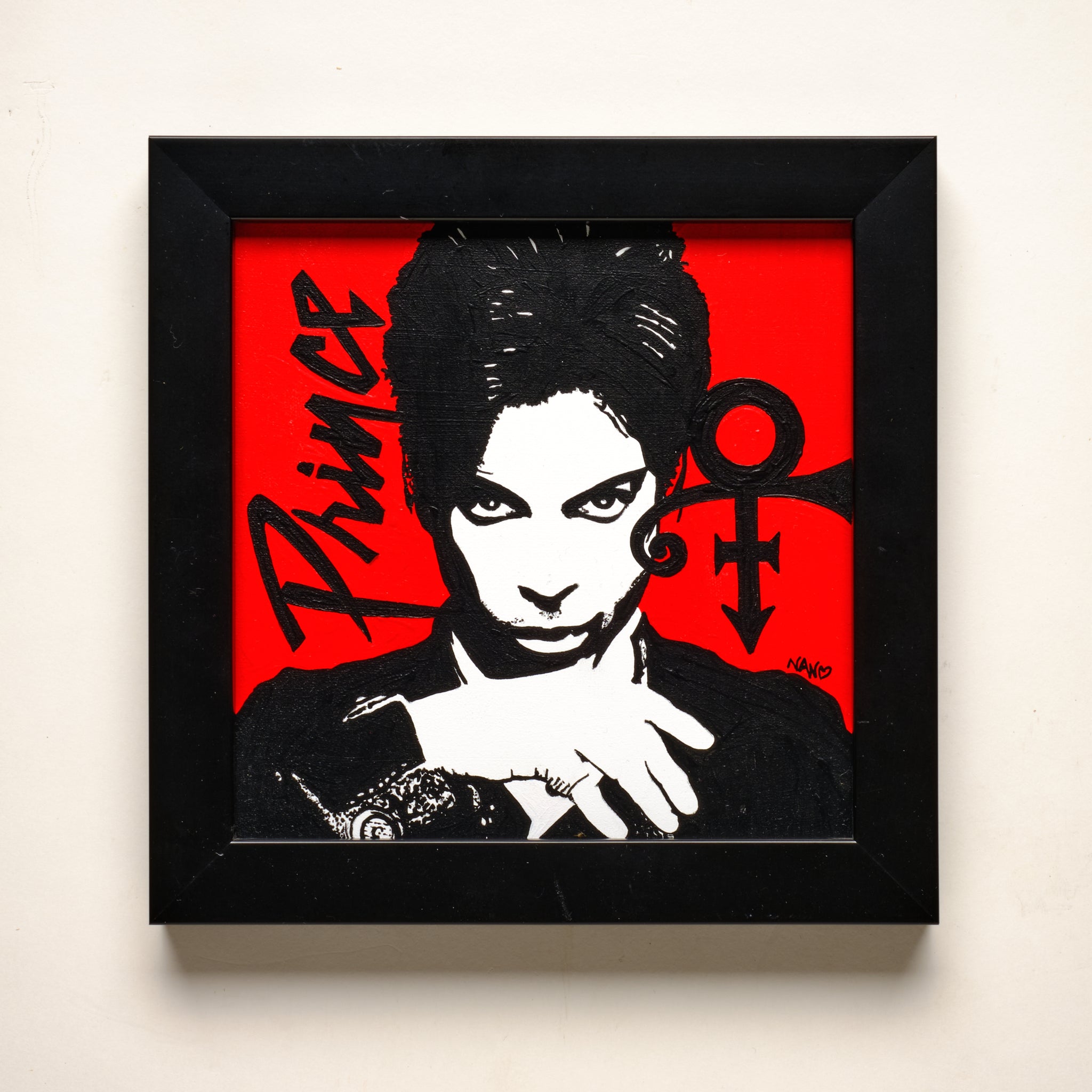 This RAD “Raspberry Beret” original is Nan’s electrified nod to Prince—piercing gaze, razor-clean lines, and that unmistakable symbol on a bold red field. Hand-painted on 6"×6" gesso board and framed in a clean black frame, it arrives ready to hang. ❤️