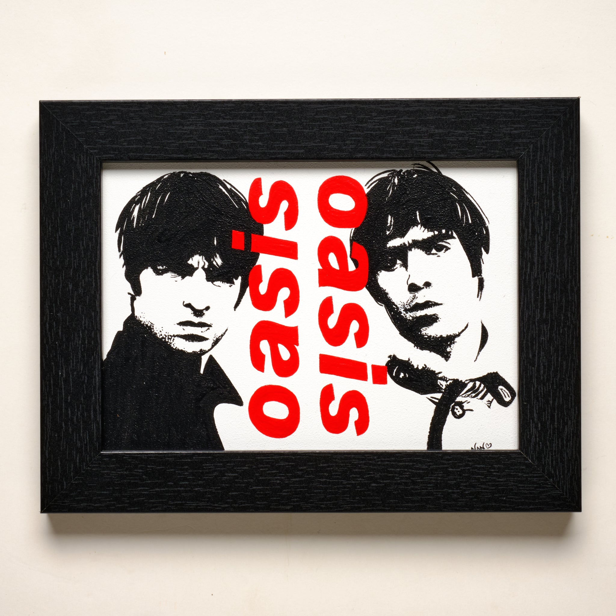 This RAD “Roll With It” original is Nan’s Britpop salute to Oasis—Gallagher glare, bold type, and that big-shouldered attitude in crisp black, white, and red. Hand-painted on 5"×7" gesso board and set in a clean black frame, it arrives ready to hang. ❤️