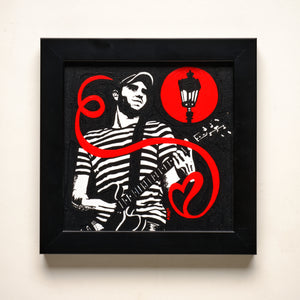 This RAD “Mercy Mercy Me” original is Nan’s salute to Streetlight Manifesto—striped-shirt stance, guitar in hand, and that signature streetlamp glowing against deep black with a flowing red ribbon-heart. Hand-painted on 6"×6" gesso board and set in a clean black frame, it arrives ready to hang. ❤️