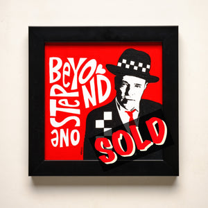 This RAD “Suggs” original is Nan’s 2-Tone salute to Madness—sharp suit, checkerboard nods, and hand-lettered “One Step Beyond” blazing across a bold red field. Hand-painted on 6"×6" gesso board and set in a clean black frame, it arrives ready to hang. ❤️