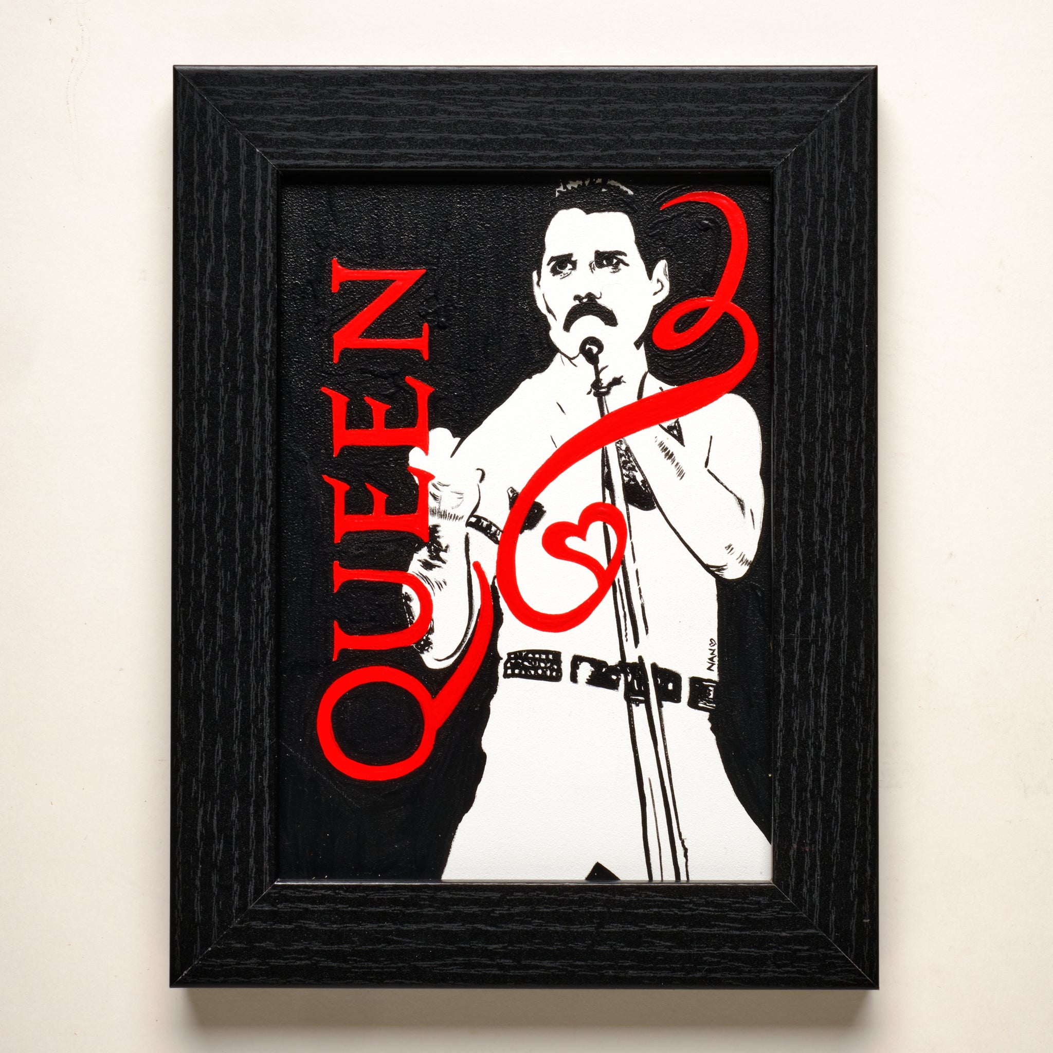 This RAD “Freddie” original is Nan’s powerhouse salute to Queen—microphone-in-hand stance, clean black-and-white portrait, and a flowing red accent that wraps the scene with arena-size drama. Hand-painted on 5"×7" gesso board and set in a simple black frame, it arrives ready to hang. ❤️