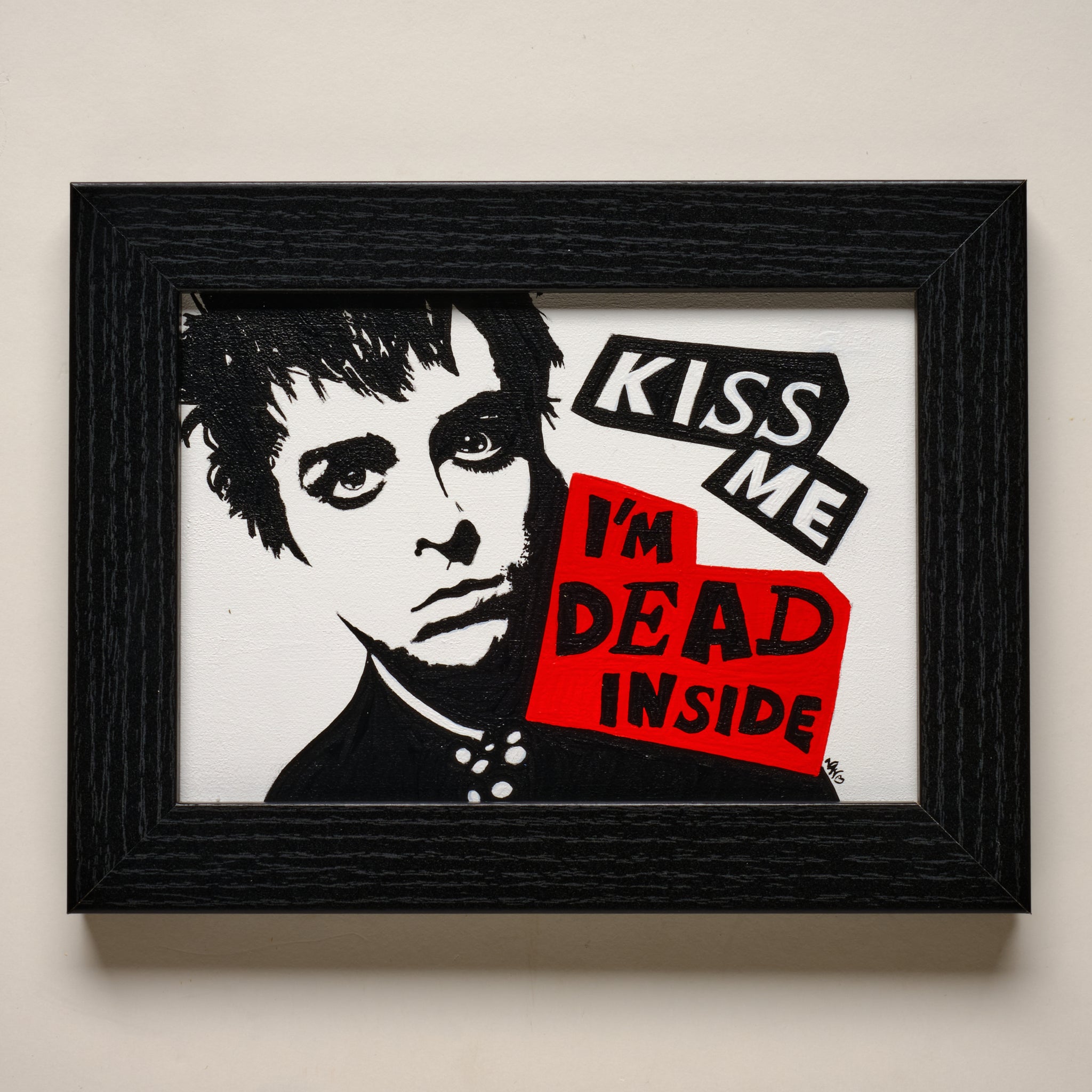 This RAD "Billie Joe Armstrong" piece is pure pop-punk attitude—Nan’s bold black, white, and red palette with cut-paper–style typography that declares “KISS ME / I’M DEAD INSIDE.” Hand-painted on 5"×7" gesso board and set in a clean black frame, it’s small, loud, and ready to hang. ❤️
